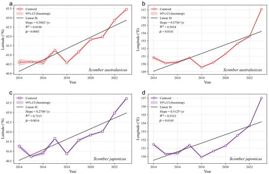 The dynamics of distribution centroids for Blue Mackerel (Scomber australasicus) and Chub Mackerel (Scomber japonicus) from 2014 to 2023. Panels (a,b) depict the changes in latitude and longitude centroids, along with their 95% confidence intervals (via bootstrap) and linear fits, for Blue Mackerel. Panels (c,d) present the corresponding data for Chub Mackerel.