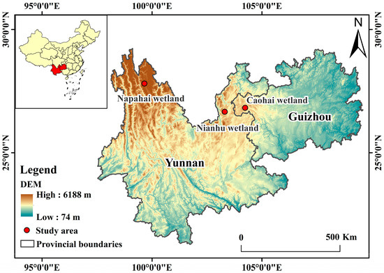 Regional context and locations of the three study wetlands on the Yunnan–Guizhou Plateau. Red circles mark Nianhu, Caohai, and Napahai; provincial boundaries are shown in gray. The background is a DEM (low–high). The inset map indicates the position of Yunnan and Guizhou within China. A north arrow, latitude–longitude graticule (WGS84), and a 0–500 km scale bar are provided for reference.