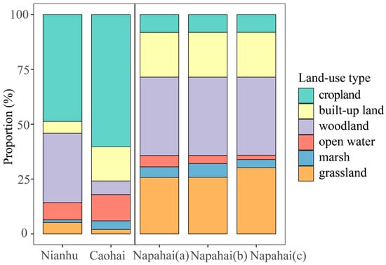 Remote sensing interpretation revealed that the Nianhu study area spans 7295.16 ha, with cropland and woodland dominating the landscape, comprising 49% and 32% of the area, respectively. Open water, built-up land, grassland, and marsh occupy much smaller proportions (approximately 8%, 5%, 5%, and 1%, respectively). Spatially, the eastern part of Nianhu is covered by open water, while the western part is dominated by marsh. Cropland is concentrated along the north and south shores of Nianhu. Built-up land is distributed in bands around the cropland, and woodland occurs along the periphery at higher elevations. Grassland is minimal, appearing only as scattered patches around the cropland and woodland (Table 1; Figure 2 and Figure 3e).