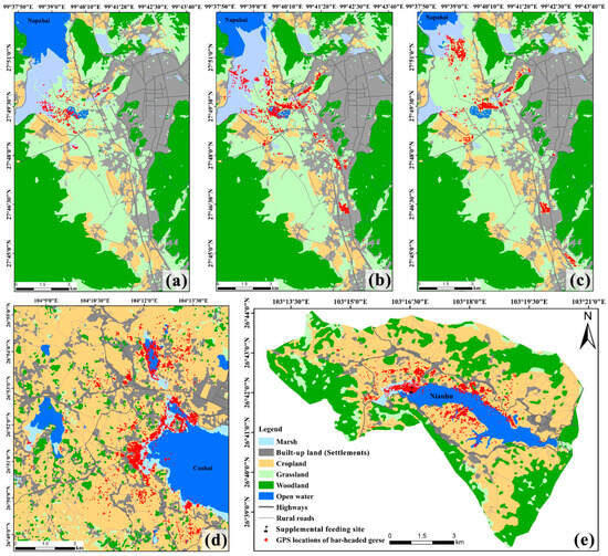 Landscape configuration of the study areas and GPS locations of wintering Bar-headed Geese. (a–c) Napahai in early, mid, and late winter, respectively; (d) Caohai; (e) Nianhu. Maps show major land-use classes and GPS locations of Bar-headed Geese. Early wintering period = October–November; mid-wintering period = December–January; late wintering period = February–April. All panels share the same legend and north arrows. Scale bars and map projection (latitude and longitude) are indicated on each panel.