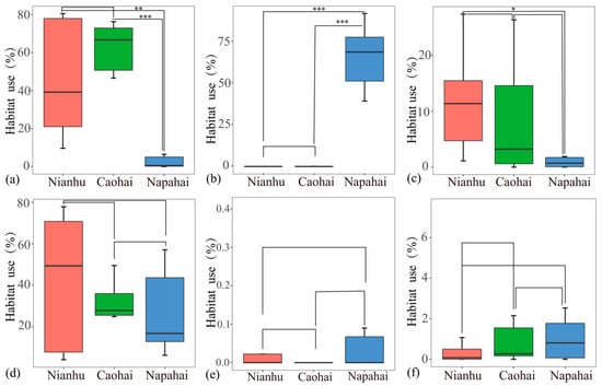 Habitat use (%) of Bar-headed Geese across three wintering sites. Boxplots show the distribution of use rates for six habitat types: (a) cropland, (b) grassland, (c) open water, (d) marsh, (e) woodland, and (f) built-up land. Bold horizontal lines denote median values; boxes span the interquartile range (IQR); whiskers extend to 1.5 × IQR. Asterisks indicate significant pairwise differences between sites (* p < 0.05; ** p < 0.01; *** p < 0.001), as determined by Mann–Whitney U tests.