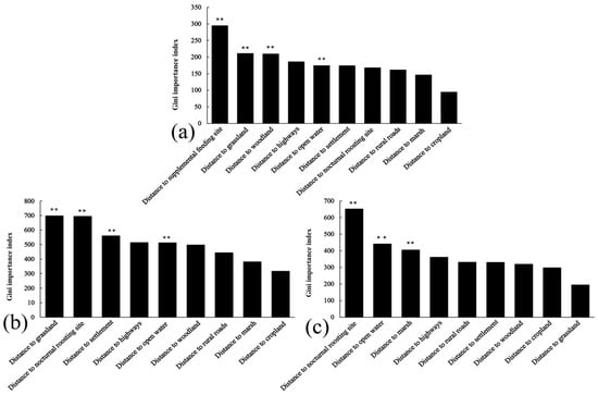 Relative importance of environmental predictors for diurnal habitat selection of wintering Bar-headed Geese, estimated with random-forest models. Bars show the Gini importance index for each predictor; asterisks denote variables with significant permutation importance (** p < 0.01; rfPermute). (a) Nianhu; (b) Caohai; (c) Napahai.