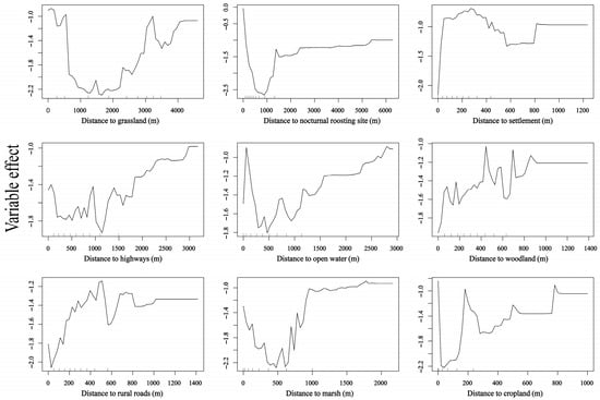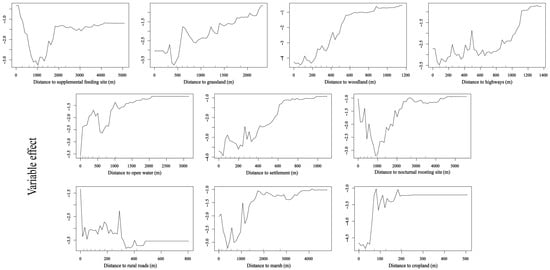 Partial dependence of nine environmental predictors on the relative habitat selection probability by wintering Bar-headed Geese at Napahai. Curves illustrate the marginal effect of each variable when all other variables are held constant.