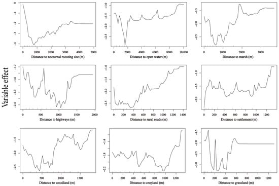 The random forest model identified distance to supplemental feeding site, distance to grassland, distance to woodland, and distance to open water as significant factors influencing diurnal habitat selection by geese at Nianhu (p < 0.01). At Nianhu, cropland, marsh, and open water were the primary diurnal foraging habitats, whereas woodland and grassland were avoided. Settlements, rural roads, and highways were treated as human-activity covariates. In the Nianhu habitat selection model, the priority of factor categories was as follows: supplemental feeding > avoided habitats > human-activity covariates > nocturnal roost site > main foraging habitat. Specifically, when distance to the supplemental feeding site was zero (i.e., at the supplemental feeding site), relative selection probability was highest, indicating a strong preference for areas near the supplemental feeding site. As the distance from grassland, woodland, and highways increased, relative selection probability also increased, suggesting a preference for areas farther from these features. Within zones of concentrated activity points, the effect of distance to open water on relative selection probability increased and then decreased, with the highest relative selection probability around 400 m. Relative selection probability increased with greater distance from settlements, indicating a preference for areas away from human dwellings. In high-use areas, relative selection probability declined as distance from the nocturnal roost site increased, highlighting the geese’s preference for habitats closer to nocturnal roost sites. The effect of distance to rural roads showed no clear avoidance pattern, as relative selection probability fluctuated in high-use areas. A longer distance to marsh was associated with lower relative selection probability in core use areas, indicating that geese did not strongly prefer locations far from marshes. The effect of distance to cropland increased within the first approximately 100 m, with relative selection probability peaking at around 80 m from cropland (Figure 5 and Figure 6).