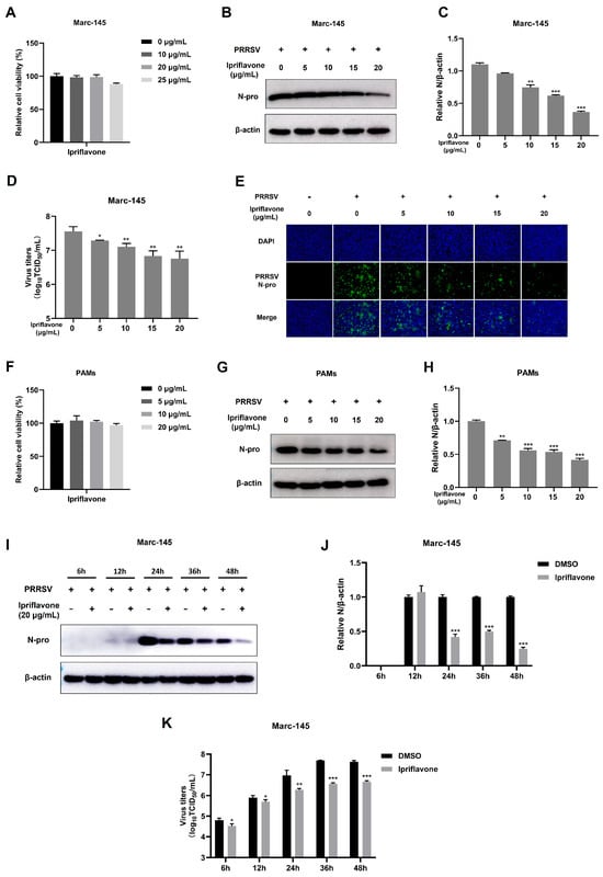 Ipriflavone significantly inhibits PRRSV replication. (A) After 48 h of ipriflavone treatment, the cell viability was determined by CCK-8 assay. (B–E) Marc-145 cells were infected with PRRSV (MOI = 0.1) in the presence of ipriflavone (0, 5, 10, 15, 20 μg/mL) for 24 h. (B) The expression levels of PRRSV N protein were detected by Western blot. (C) The relative expression levels of N protein were quantified using Image J 1.53e software. (D) The virus titers were analyzed by TCID50. (E) Immunofluorescence analysis of PRRSV N protein; Scale bar = 100 μm. (F) Viability of PAMs treated with the indicated concentrations of ipriflavone. (G,H) PAMs were infected with PRRSV (MOI = 1) in the presence of ipriflavone (0, 5, 10, 15, 20 μg/mL) for 24 h. (G) The expression levels of PRRSV N protein were detected by Western blot. (H) The relative expression levels of N protein were quantified using Image J software. (I–K) Marc-145 cells were infected with PRRSV (MOI = 0.1) in the absence or presence of ipriflavone (20 μg/mL). At 6, 12, 24, 36, and 48 hpi, the cells were collected. (I) The expression levels of PRRSV N protein were detected by Western blot. (J) The relative expression levels of N protein were quantified using Image J software. (K) The virus titers were analyzed by TCID50. The asterisks in the figures indicate significant differences (* p < 0.05, ** p < 0.01, *** p < 0.001).
