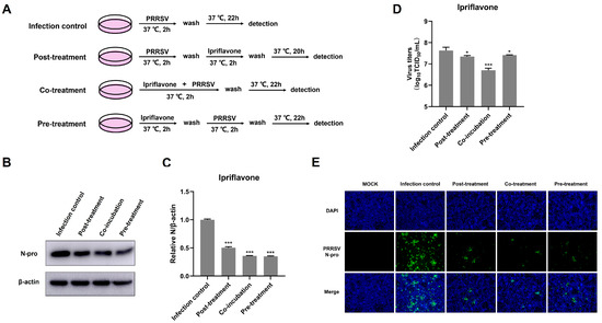 Marc-145 cells were seeded in 6-well plates at 37 °C, following the mock treatment (untreated: no ipriflavone was added), post-treatment (ipriflavone was added 2 h after PRRSV infection), co-treatment (ipriflavone and PRRSV were added together), or pre-treatment (ipriflavone was added 2 h before PRRSV infection). After washing with PBS, the samples were collected at 24 hpi and subjected to indicated assays.