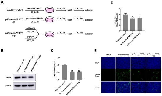 Ipriflavone could not directly reduce the infectivity of PRRSV. (A) Schematic of experimental setup of ipriflavone and PRRSV treatments in Marc-145 cells. (B) PRRSV N protein levels were detected by Western blot. (C) The relative expression levels of N protein were quantified using Image J software. (D) The virus titers were analyzed by TCID50. (E) Immunofluorescence analysis of PRRSV N protein; Scale bar = 100 μm. The asterisks in the figures indicate significant differences (* p < 0.05, ** p < 0.01, *** p < 0.001).