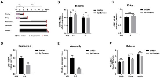 Based on the inhibition of ipriflavone on PRRSV replication, we next designed binding, entry, replication, assembly, and release assays to further assess its inhibitory effect on viral life-cycle stages (Figure 4A). The results showed that no significant difference was observed in the binding and entry experiments when comparing the untreated group with the ipriflavone-treated groups (Figure 4B,C). Nevertheless, ipriflavone could affect PRRSV infection during virus replication (Figure 4D) and assembly stages (Figure 4E). Furthermore, ipriflavone affected the virus release stage after 30 min of treatment, but it failed to have any significant effect after 10 or 60 min of treatment. (Figure 4F). These results indicated that ipriflavone mainly blocked virus replication and assembly stages.