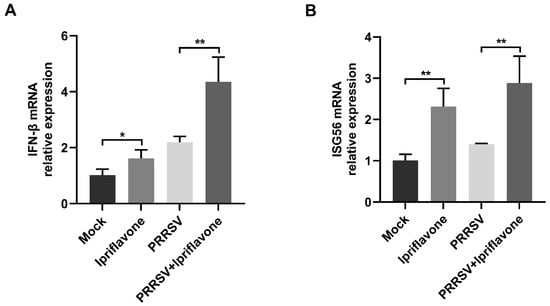 Ipriflavone effectively induced the activation of I-IFN signaling. Marc-145 cells were incubated with ipriflavone (20 μg/mL) and infected with or without PRRSV (MOI = 0.1) for 24 h, then the cells were collected. (A,B) The mRNA levels of IFN-β and ISG56 were measured by qPCR. The asterisks in the figures indicate significant differences (* p < 0.05, ** p < 0.01).