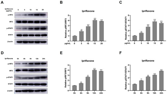 Ipriflavone effectively induced the activation of IRF3. Marc-145 cells were treated with ipriflavone (0, 5, 10, 15, 20 μg/mL) for 24 h. (A) The pIRF3, IRF3, pSTAT1, and STAT1 were detected by Western blot. β-actin was used as an internal control. (B,C) The relative expression levels of pIRF3 and pSTAT1 were quantified using Image J software. (D–F) The levels of pIRF3, IRF3, pSTAT1, and STAT1 were also detected in cells treated with ipriflavone at different times (0, 6, 9, 12, and 24 h) by Western blot. The asterisks in the figures indicate significant differences (** p < 0.01, *** p < 0.001).
