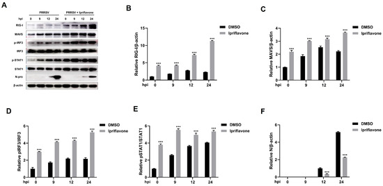 Ipriflavone inhibits PRRSV replication by promoting the activation of RIG-I/IRF3 signaling pathway. Marc-145 cells were mock treated or treated with ipriflavone and then infected with PRRSV (MOI = 0.1) for different time periods (0, 9, 12, and 24 hpi). (A) The RIG-I, MAVS, pIRF3, IRF3, pSTAT1, STAT1, and PRRSV N protein were detected by Western blot. (B–F) The relative expression levels of RIG-I, MAVS, pIRF3, pSTAT1, and N protein were quantified using Image J software. The asterisks in the figures indicate significant differences (*** p < 0.001).