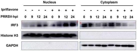 Ipriflavone treatment significantly promotes IRF3 nuclear translocation during PRRSV infection. Marc-145 cells were treated with ipriflavone in the absence or presence of PRRSV (MOI = 0.1). After 0, 9, 12, and 24 h, the cells were collected and the levels of IRF3 in the cytoplasmic and nuclear lysates were analyzed by Western blot with GAPDH and histone H3 as cytoplasmic fraction and nuclear fraction markers, respectively.