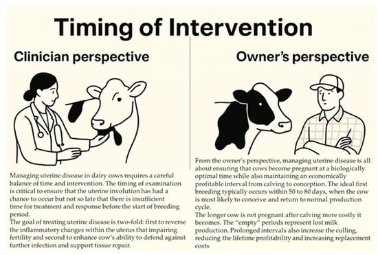 Managing uterine disease in dairy cows requires a careful balance of timing and intervention. Timing of the examination is critical to ensure that it occurs after uterine involution has had a chance to occur, but not so late that there is insufficient time for treatment and response before the start of the breeding period [50,51]. Typically, postpartum uterine involution takes ~5 wk [1]. However, it can be delayed or disrupted by infections, and the clinician must assess the cow at a point where treatment can effectively address any problems without interfering with this natural recovery process [52].