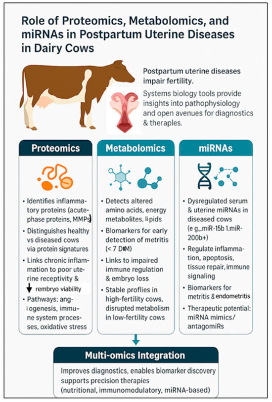Postpartum uterine diseases such as metritis and endometritis impair reproductive performance and cause substantial economic losses in dairy cows worldwide. The multifactorial etiology, involving polymicrobial infections and complex host immune responses, poses diagnostic and therapeutic challenges. Traditional treatments rely on antibiotics, e.g., cephalosporins like ceftiofur and cephapirin, with broad-spectrum efficacy. However, emerging antimicrobial resistance, biofilm formation by pathogens such as Trueperella pyogenes, Fusobacterium necrophorum, and Escherichia coli, and bacterial virulence factors have reduced effectiveness of conventional therapies. Advances in systems biology, particularly proteomics, metabolomics, and microRNA (miRNA) profiling, have provided unprecedented insights into the molecular mechanisms underpinning uterine disease pathophysiology. Proteomic analyses reveal dynamic changes in inflammatory proteins and immune pathways, whereas metabolomics highlight shifts in energy metabolism and bacterial–host interactions. Furthermore, miRNAs have critical roles in post-transcriptional gene regulation affecting immune modulation, inflammation, and tissue repair, and also in modulating neutrophil function and inflammatory signaling. Uterine inflammation not only disrupts local tissue homeostasis but also compromises early embryo development by altering endometrial receptivity, cytokine milieu, and oocyte quality. Integration of multi-omics approaches, combined with improved diagnostics and adjunct therapies—including micronutrient supplementation and immunomodulators—offers promising avenues for enhancing disease management and fertility in dairy herds. This review synthesizes current knowledge on proteomics, metabolomics, and miRNAs in postpartum uterine diseases and highlights future directions for research and clinical applications.