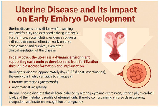 Beyond uterine health, postpartum infections also have profound effects on early embryonic development and fertility. The uterus provides a specialized environment essential for embryo survival, growth, and maternal recognition of pregnancy. Inflammatory insults and altered metabolic and immune signaling within the uterine milieu can impair endometrial receptivity and embryo viability, increasing embryonic loss, even after clinical resolution of uterine infection [24,25]. This intersection of uterine disease with reproductive success highlights importance of timely diagnosis and effective management.