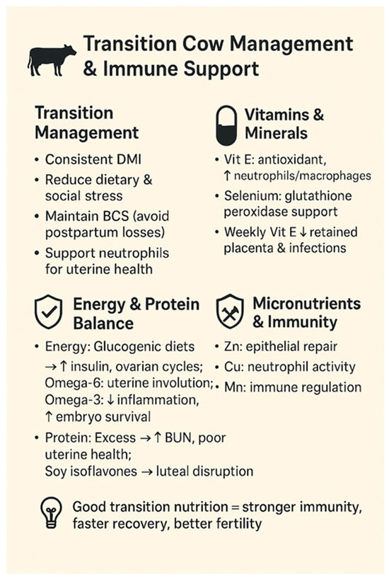 - Chen, Y.H.; Chen, Y.M.; Tu, P.A.; Lee, K.H.; Chen, J.Y.; Hsu, J.T. Effect of Supplementing Vitamin E, Selenium, Copper, Zinc, and Manganese during the Transition Period on Dairy Cow Reproductive Performance and Immune Function. Vet Sci. 2023, 10, 225. [Google Scholar] [CrossRef]