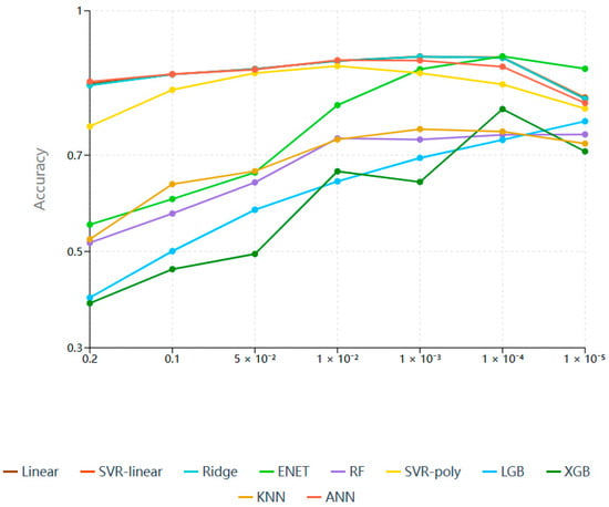 As illustrated in Figure 1 and Figure S1, for linear models (Linear, SVR-linear, Ridge, Elastic Net), prediction accuracy steadily increased as the GWAS p-value threshold decreased from 0.2 to 1 × 10−4, reaching a maximum at 1 × 10−4; further tightening the threshold led to a decline in accuracy. For nonlinear models (Random Forest, SVR-polynomial, LightGBM, XGBoost, KNN, and ANN), prediction accuracy generally improved with stricter thresholds, although the exact peak varied among models, with some reaching maximum accuracy at 1× 10−4 and others at more or less stringent cutoffs. Overall, the trend across all candidate models indicated improved prediction accuracy, with decreasing GWAS p-value thresholds up to a point.