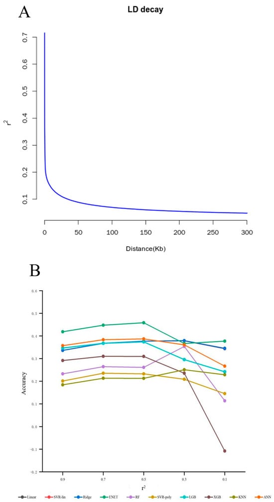 Genome-wide linkage disequilibrium (LD) decay analysis was conducted on the original genotype data of the reference population using PopLDdecay(v3.43) [37] software. The LD decay curve indicated that the squared correlation coefficient (r2) decreased to 0.1 at a genomic distance of approximately 25 kb (Figure 2A). Based on this result, a sliding window of 200 kb with a step size of 20 kb was applied for SNP filtering in subsequent analyses. Gradient LD pruning was then performed using PLINK 2.0 with varying r2 thresholds (0.9, 0.7, 0.5, 0.3, and 0.1). Prediction accuracies of various ML models exhibited an initial increase, followed by a decline as the r2 threshold decreased, achieving the best overall performance at r2 = 0.5 (Figure 2B and Figure S2 and Table S2). Nevertheless, even at this optimal threshold, the prediction accuracies remained significantly lower than those obtained through GWAS-based SNP selection, suggesting that relying solely on whole-genome LD pruning of resequencing data is suboptimal. This highlights the urgent need for more efficient SNP screening and feature selection strategies.