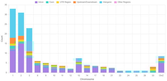 A total of 177 key SNPs associated with chicken abdominal fat traits were identified in the reference population and subsequently annotated by comparison against the NCBI and Ensembl databases (Figure 3). Among these SNPs, 89 were located in intronic regions, 9 in exonic regions, 8 in 3′ untranslated regions (3′ UTR), 5 in 5′ untranslated regions (5′ UTR), 11 in upstream or downstream regions, and 55 in intergenic regions. Ultimately, these SNPs were annotated to 151 genes across the whole genome, of which 115 genes have been officially named (Table S9).
