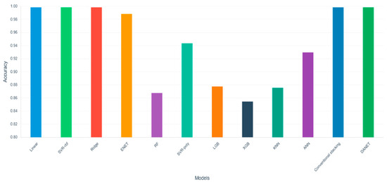 Figure 5 and Table 5 demonstrate that the conventional stacking framework achieves a prediction accuracy of 0.9958 by integrating heterogeneous base models, supported by the strong accuracies of the individual base models (Linear: 0.9936; ENET: 0.9830; SVR-poly: 0.9404; ANN: 0.9296) and the meta-model (Ridge: 0.9937). This indicates that model integration facilitates knowledge fusion and enhances predictive performance. Notably, the DAWSELF framework further improves accuracy to 0.9965, surpassing the conventional stacked framework and confirming the superiority of its innovative design.