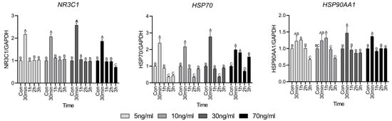 NR3C1 encodes the glucocorticoid receptor (GR) and Figure 1 represents the expression level of the gene related to the GR-activated mechanism. NR3C1 expression was significantly elevated at 30 min of treatment, regardless of cortisol concentration, after which it was similar to that in the control group. However, in the 70 ng/mL group, it was significantly decreased compared to that in the control group at 3 h. HSP70 and HSP90AA1 expression was high at 30 min, similar to that of NR3C1. However, HSP70 expression was lower or similar to that in the control after 30 min to 2 h of treatment and a resurgence in expression was observed at 3 h of treatment as the cortisol concentration increased. In contrast, HSP90AA1 expression gradually decreased after 30 min, regardless of the cortisol concentration, and lower or similar expression was observed compared to the control group.