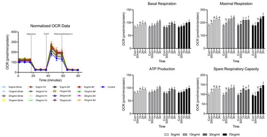 OCR analysis is a method used to evaluate the respiration function of mitochondria and Figure 2 shows the results of short-term treatment with various cortisol treatment conditions. Evaluating respiratory function, no significant differences were noted in basal respiration and ATP production, compared to the control until 1 h, but both significantly increased after 2 h. Maximum respiration and spare respiratory capacity tended to increase significantly over 30 min.