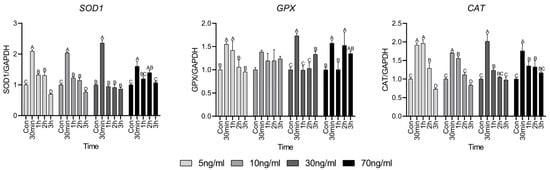 Antioxidant factor-related gene expressions. Values are presented as mean ± standard error. A–D Different letters in the graph represent significant differences within the same concentration treatment groups (p < 0.05).