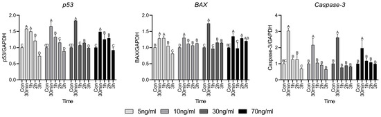 Cell death factors are closely related to cell survival and the expression of p53, BAX, and Caspase-3 is presented in Figure 4. The expression of p53 was significantly elevated at 30 min, which then gradually decreased over time. However, in the treatment group with concentrations above 30 ng/mL, the expression of BAX increased at 2 and 3 h compared to that in the control. Regardless of the cortisol concentration, the expression of Caspase-3 significantly increased only at 30 min, after which a lower or similar expression was observed compared to the control group.