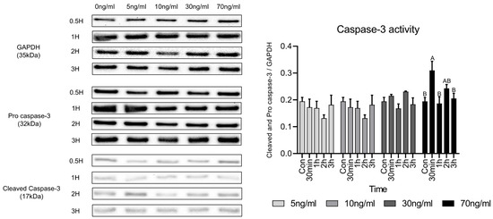 Comparison of caspase-3 activity-related proteins under various cortisol treatment conditions. Values are presented as mean ± standard error. A,B Different letters in the graph represent statistically significant differences within the same concentration treatment groups (p < 0.05).