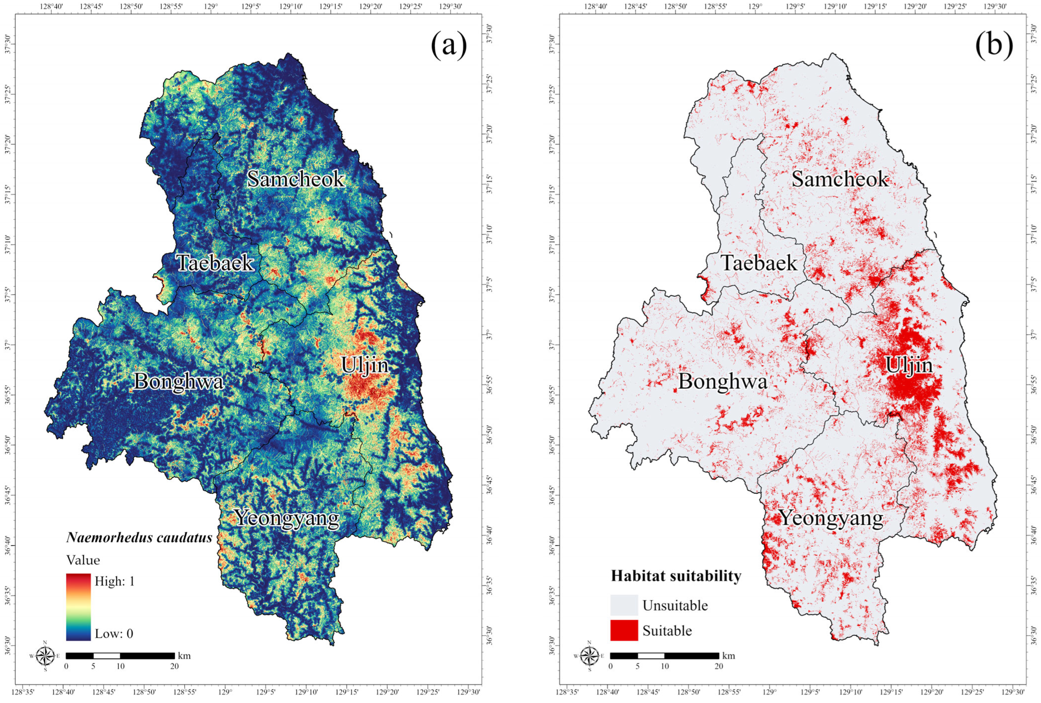- Seo, C.W.; Choi, T.Y.; Choi, Y.S.; Kim, D.Y. A Study on Wildlife Habitat Suitability Modeling for Goral (Naemorhedus caudatus raddeanus) in Seoraksan National Park. J. Korean Environ. Res. Technol. 2008, 11, 28–38. [Google Scholar]