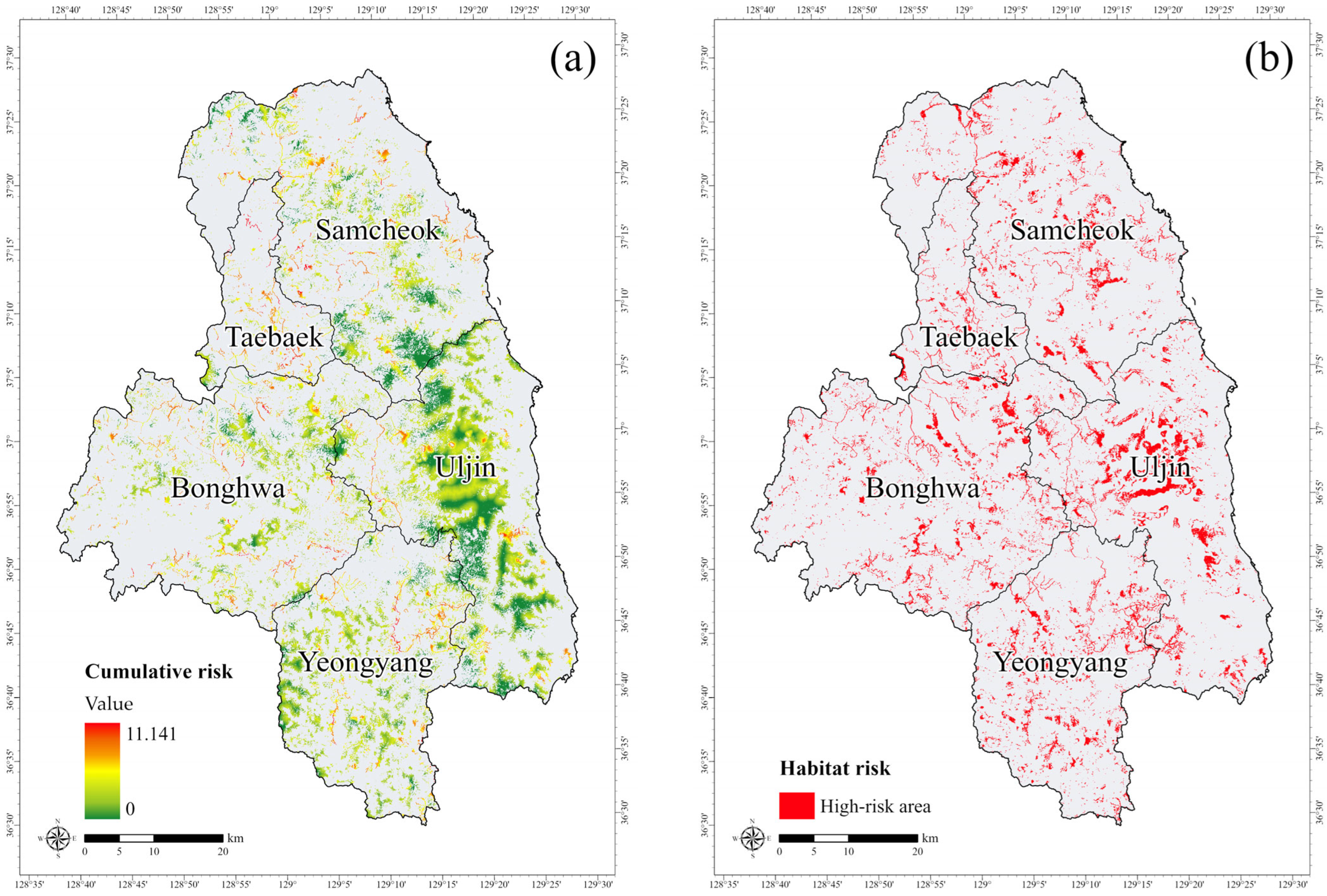 Chicago/Turabian StylePark, Soyeon, Minkyung Kim, and Sangdon Lee. 2025. "Integrating Habitat Prediction and Risk Assessment to Prioritize Conservation Areas for the Long-Tailed Goral (Naemorhedus caudatus)" Animals 15, no. 19: 2848. https://doi.org/10.3390/ani15192848