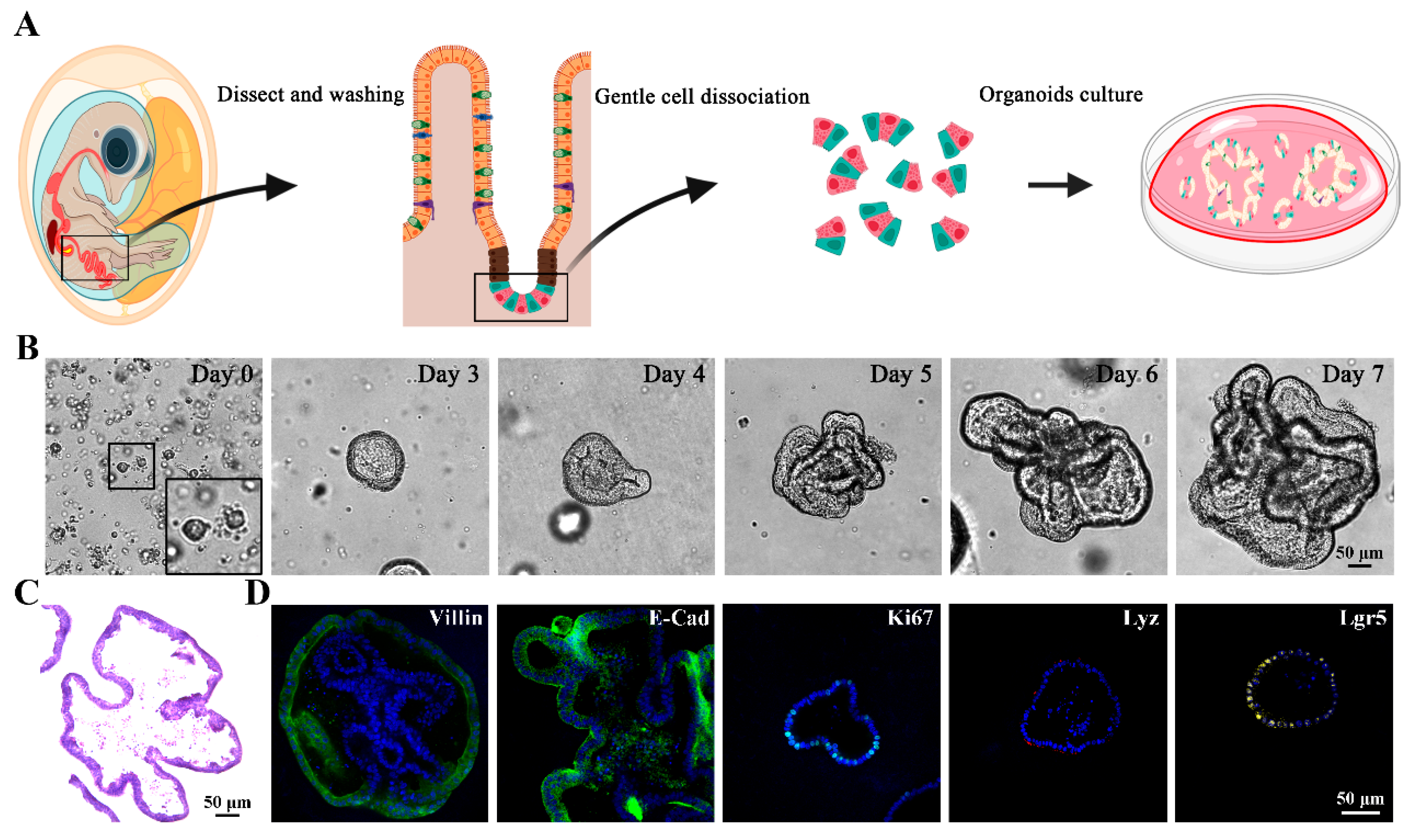 Figure 1. Isolation and identification of chicken 3D intestinal organoids. (A) Schematic illustration of the isolation and culture protocol for chicken intestinal organoids. (B) Light microscopic images showing the time-course development of 3D chicken intestinal organoids. Scale bar = 50 μm. (C) H&E staining of 3D chicken intestinal organoids. Scale bar = 50 μm. (D) Immunofluorescence assays (IFA) of 3D chicken intestinal organoids for enterocytes (Villin and E-Cad, green), proliferating cells (Ki67, green), Paneth cells (Lyz, red) and intestinal stem cells (Lgr5, yellow). Nuclei were stained with DAPI (blue). Scale bar = 50 μm.