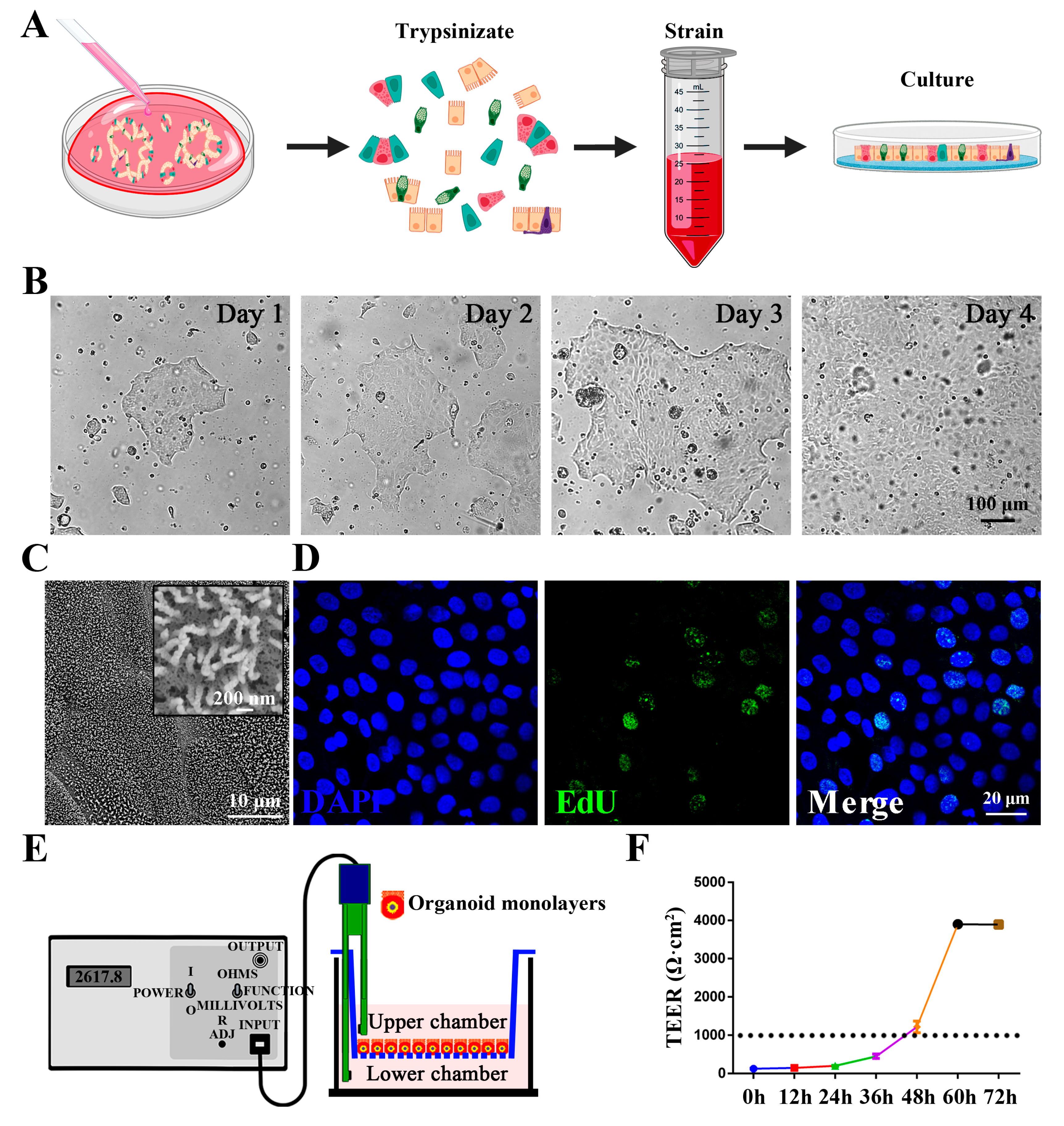 Figure 2. Establishment and characterization of chicken intestinal organoid monolayers. (A) Schematic illustration of chicken 2D intestinal organoid monolayer establishment. (B) The dissociated chicken organoids were regenerated into a confluent intestinal organoid monolayer within 4 days. Scale bar = 100 μm. (C) The intestinal microvilli morphology of confluent intestinal organoid monolayers as observed by SEM. Scale bars = 200 nm or 10 μm. (D) Confocal micrographs showing nuclear staining (DAPI, blue) and EdU staining (green) in chicken intestinal organoid monolayers. Scale bar = 20 μm. (E) Schematic of TEER measurement across organoid monolayers in transwell plates. (F) TEER dynamics of chicken organoid monolayers over 48 h.