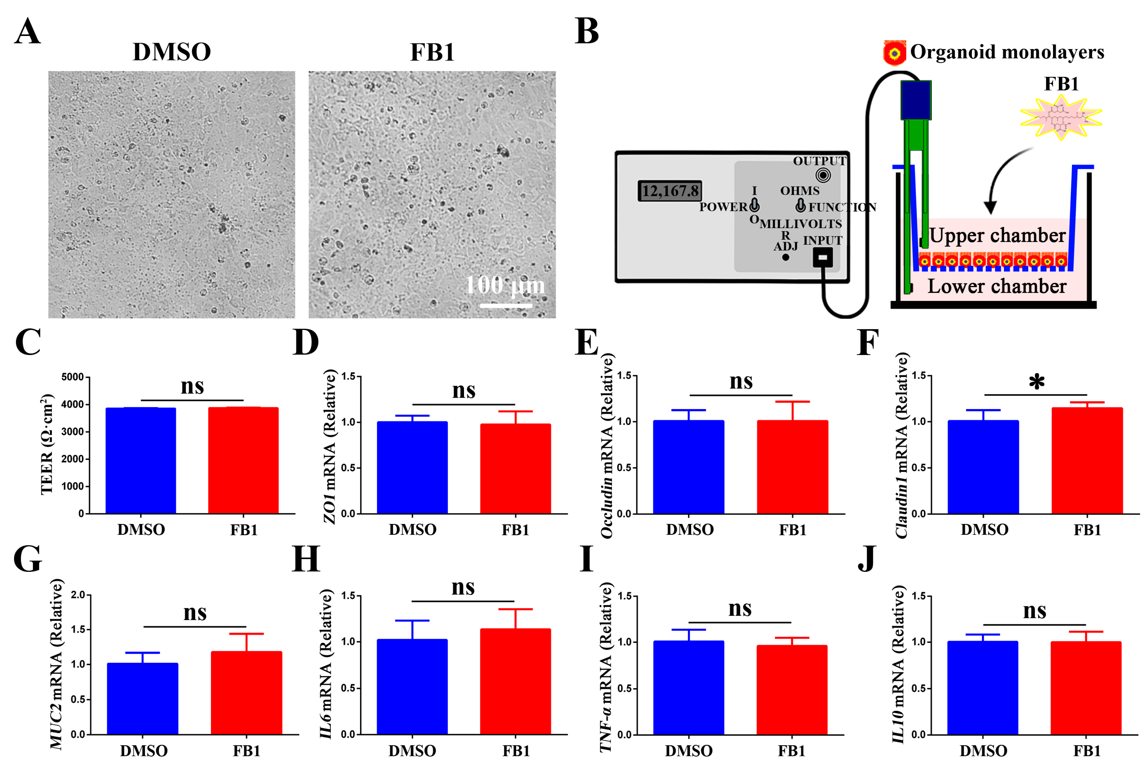 Figure 3. Effects of FB1 on the tight junction function and inflammatory response in chicken intestinal organoid monolayers. (A) Light microscopic images of chicken intestinal organoid monolayers treated with FB1 for 48 h. Scale bar = 100 μm. (B,C) TEER values of chicken intestinal organoid monolayers treated with FB1 for 48 h. (DG) mRNA levels of tight junction proteins (ZO1, Occludin, and Claudin1) and goblet cell secreted mucin (MUC2) in FB1-treated chicken intestinal organoid monolayers at 48 h. (HJ) mRNA levels of pro- and anti-inflammatory cytokines IL6, TNF-α, and IL10 from FB1-treated chicken intestinal organoid monolayers at 48 h. * p < 0.05, ns: not significant.