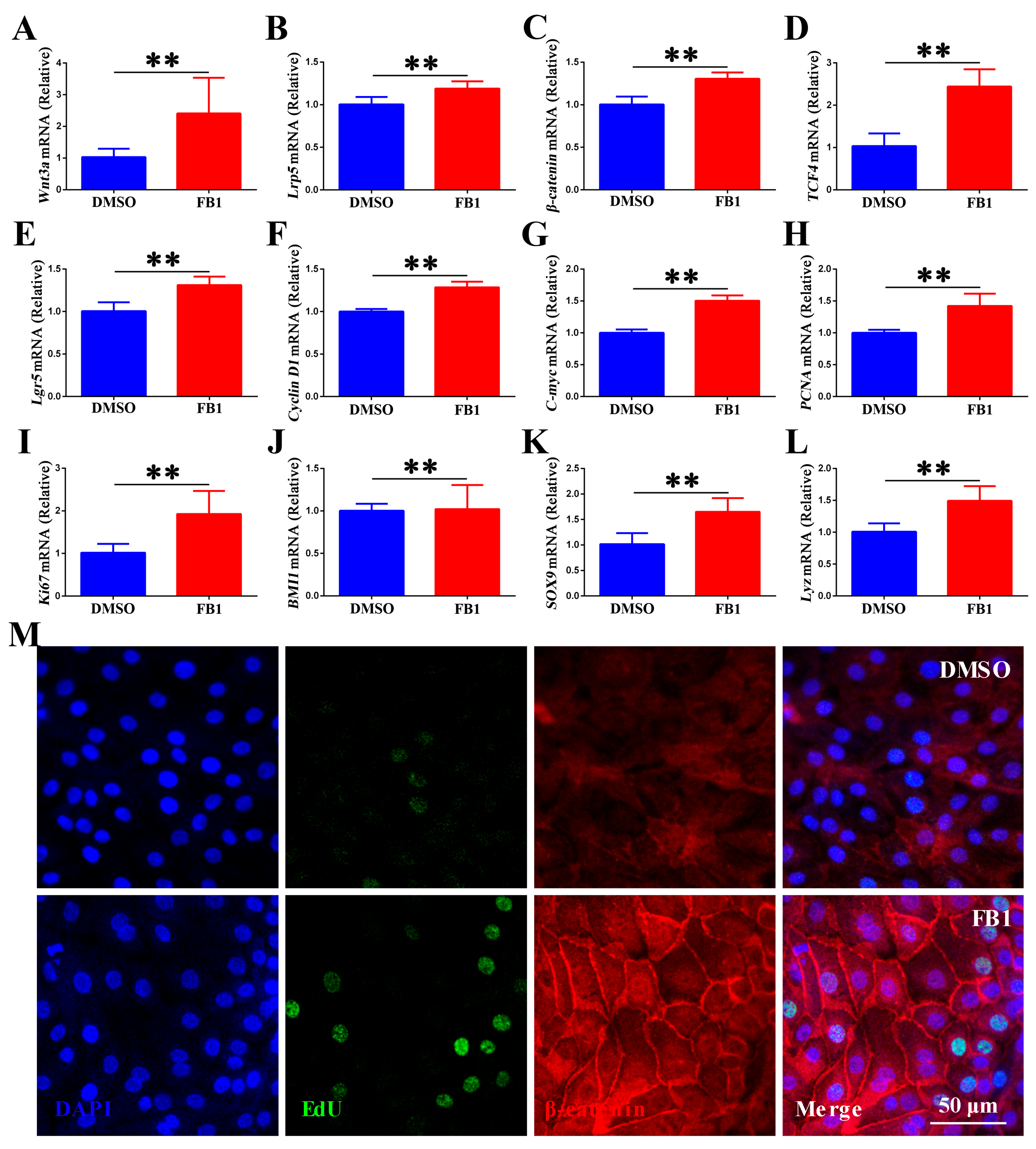 Figure 4. FB1 activates the Wnt/β-catenin signaling pathway in chicken intestinal organoid monolayers. 2D chicken intestinal organoids were treated with 20 μg/mL FB1 for 48 h. (AL) mRNA levels of Wnt3a, Lrp5, β-catenin, TCF4, Lgr5, Cyclin D1, c-myc, PCNA, Ki67, Bmi1, SOX9 and Lyz of chicken intestinal organoid monolayers. (M) Confocal microscopic images showing the expression and subcellular localization of β-catenin. Edu is stained green, β-catenin red, and nuclei blue. Scale bar = 50 μm. ** p < 0.01.