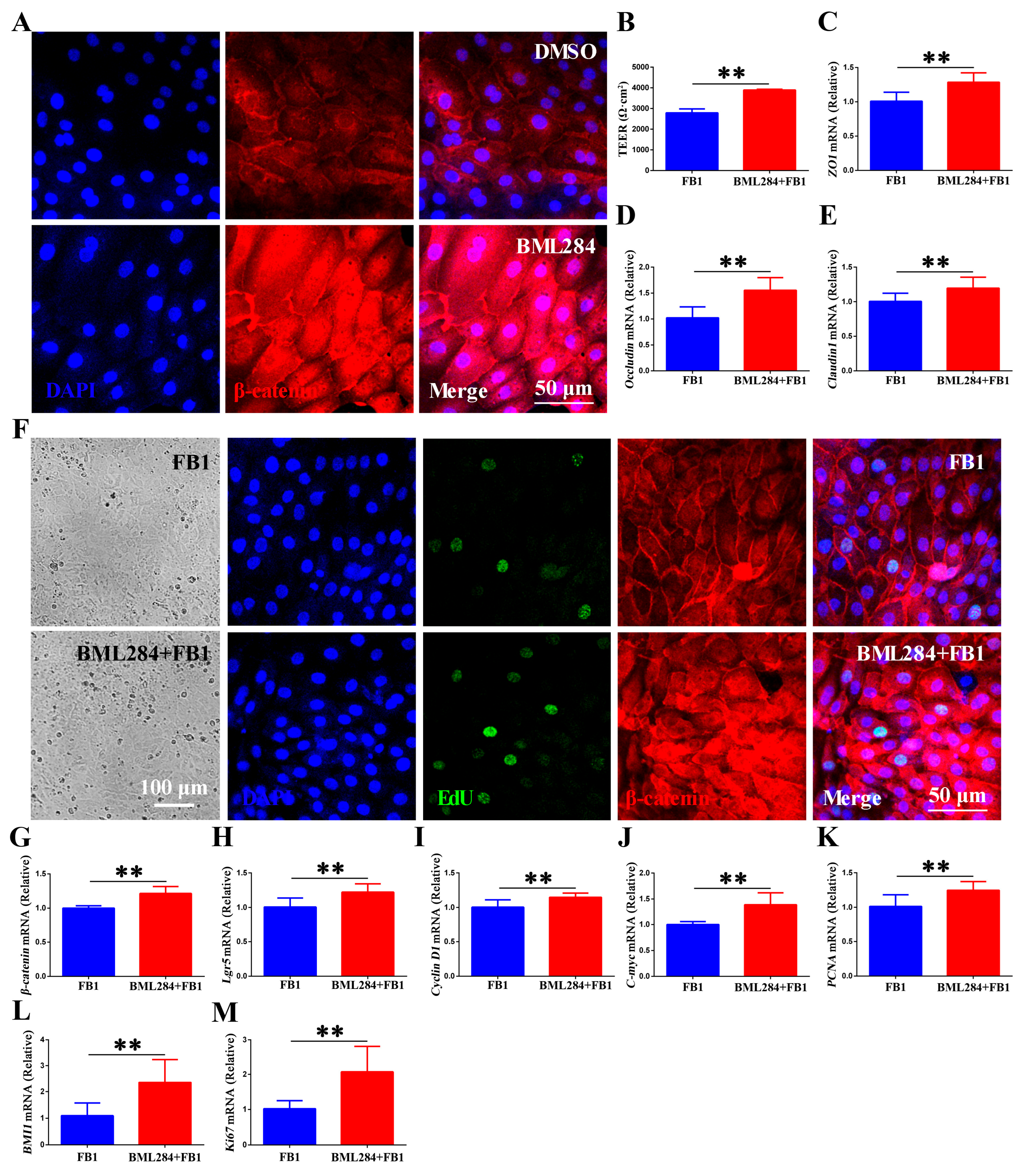 Figure 5. Wnt/β-catenin signaling promotes the renewal and regeneration of the chicken intestinal epithelium following FB1 exposure. (A) Confocal microscopic images showing β-catenin expression and localization in BML284-treated chicken intestinal organoid monolayers. Scale bar = 50 μm. (BM) Chicken intestinal organoid monolayers were pretreated with 10 μM BML284 for 24 h and then incubated with 20 μg/mL FB1 for 48 h. (B) TEER values of chicken intestinal organoid monolayers. (CE) mRNA levels of ZO1, Occludin and Claudin1 of chicken intestinal organoid monolayers. (F) Cell morphology observed by light microscope (scale bar = 100 μm). Confocal images of nuclear staining (blue), EdU staining (green) and β-catenin staining (red) in chicken intestinal organoid monolayers. Scale bar = 50 μm. (GM) mRNA levels of β-catenin, Lgr5, Cyclin D1, c-myc, PCNA, BMI1, and Ki67 in chicken intestinal organoid monolayers. ** p < 0.01.