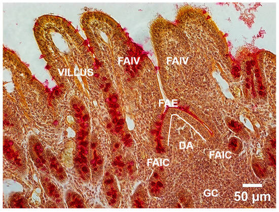 Mucicarmine (MC) Staining of Peyer’ patches (PPs) in porcine ileum with corresponding tissue segments measured in the study. (FAE—Follicle-associated epithelium marked with a white line, DA—“dome area” or subepithelial dome (SED), GC—germinative center, FAIC—Follicle associated crypt and FAIV—Follicle associated intestinal villus) (Scale Bar = 50 μm).