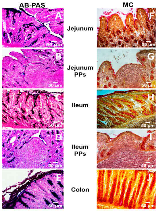 Representative histological micrographs of jejunum and ileum without and with Peyer’s patches (PPs), and colon stained with Alcian Blue–Periodic Acid–Schiff (AB-PAS) (A–E) and Mucicarmine (MC) (F–J). Histomorphometric analysis of follicle-associated epithelium, villi, and colonic crypts was conducted in the jejunum, ileum, and colon using two staining methods. (Scale bar = 50 μm).