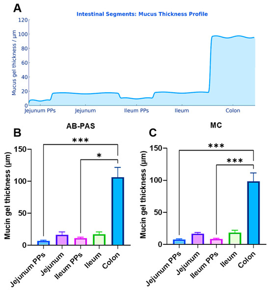 (A) Proximal-to-distal gradient of mucus-gel thickness in the porcine intestine. The schema shows a stepwise increase in mucus thickness from jejunum to colon. Over the follicle-associated epithelium (FAE) of Peyer’s patches (PPs) in both jejunum and ileum, the mucus layer is thinnest (around 10 μm). In adjacent mucosa, thickness increases progressively along the small intestine, exceeding ~17 μm in the distal ileum. A further step-increase occurs at the ileo–colonic junction, and the colon exhibits the greatest thickness (~100 μm). Alcian Blue–Periodic Acid–Schiff (AB-PAS) and mucicarmine (MC) stains supports the marked thinning over PPs and the proximal-to-distal thickening of the mucus barrier. (B,C) Thickness of the mucus layer (mean ± SEM) measured on the surface PPs in the jejunum and ileum, and on the adjacent regular mucosa of the jejunum, ileum, and colon, as determined by AB-PAS and MC (Kruskal–Wallis H test followed by Dunn’s post hoc test for AB-PAS and one-way analysis of variance (ANOVA) followed by Tukey’s post hoc test for MC). (n = 6; ns p ≥ 0.05; * p < 0.05; ** p < 0.01; *** p < 0.001).