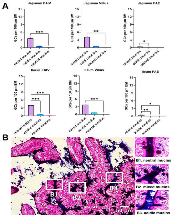 (A) Relative frequency of goblet cells (GCs)-number per 100 μm of basement membrane (BM)-by mucin type (neutral, mixed, acidic) from AB-PAS staining. Goblet cell counts in FAIV versus adjacent regular villi of jejunum and ileum, and specifically within the FAE overlying PPs (after Shapiro–Wilk normality assessment, all comparisons were analyzed with Kruskal–Wallis H test followed by Dunn’s post hoc test; only FAIV in ileum was analyzed with ANOVA followed by Tukey’s post hoc test). (n = 6; ns p ≥ 0.05; * p < 0.05; ** p < 0.01; *** p < 0.001). (B) Representative AB-PAS-stained jejunum section showing neutral mucins B1 (magenta; AB−, PAS+), mixed mucins B2 (deep purple; AB+ PAS+), and acidic mucins B3 (blue; AB+ PAS-). (Scale Bar = 50 μm). Abbreviations: FAIV, follicle-associated intestinal villus; AB-PAS, Alcian Blue–Periodic Acid–Schiff; FAE, follicle-associated epithelium, PP, Peyer’s patch.