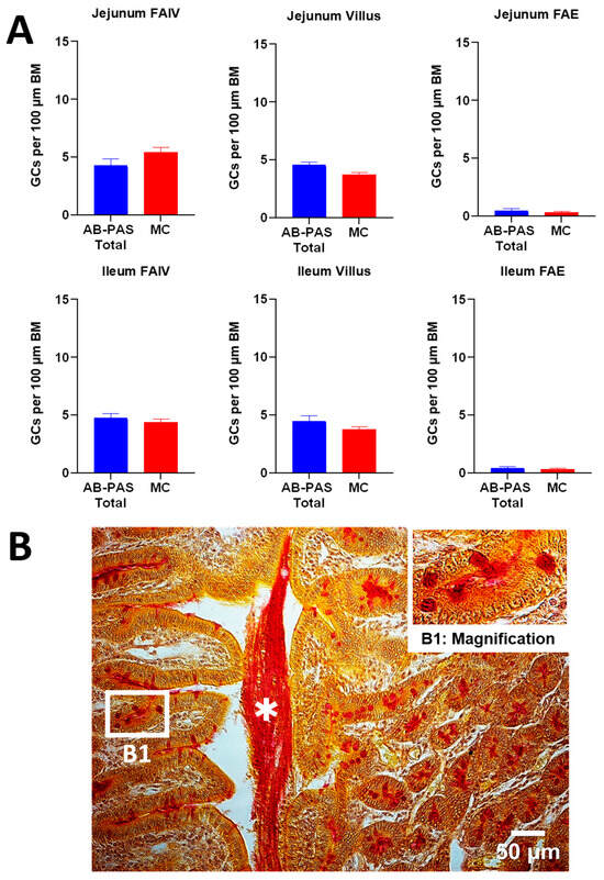(A) Goblet cell density (GCs per 100 μm basement membrane (BM)) on FAIV versus adjacent villi in jejunum and ileum, and on FAE in jejunum and ileum, using AB-PAS and MC staining. All of the data were normally distributed and compared by Student’s t-test. (n = 6; ns p ≥ 0.05; * p < 0.05; ** p < 0.01; *** p < 0.001). (B) Mucicarmine-stained ileal section with a condensed mucus layer partially peeled from the right villus apices (middle; asterisk). The upper-right inset (B1) magnifies the boxed area and highlights goblet cells whose mucins range from pink to deep red. (Scale Bar = 50 μm). Abbreviations: FAIV, follicle-associated intestinal villus; FAE, follicle-associated epithelium; AB-PAS, Alcian Blue–Periodic Acid–Schiff; MC, mucicarmine.