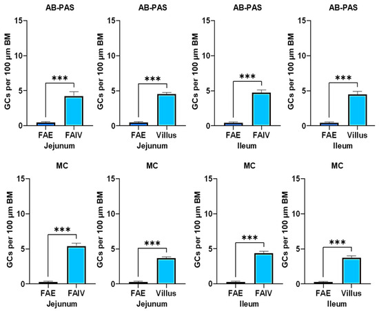 Comparison of the total relative number of goblets cells (GCs) per 100 μm of basement membrane (BM) overlying the FAE with either the follicle-associated villus (FAIV) or regular villi in the jejunum and ileum, using both staining methods. All the data were normally distributed and analyzed using Student’s t-test. (n = 6; ns p ≥ 0.05; * p < 0.05; ** p < 0.01; *** p < 0.001). Abbreviations: FAIV, follicle-associated intestinal villus; FAE, follicle-associated epithelium; AB-PAS, Alcian Blue–Periodic Acid–Schiff; MC, mucicarmine.