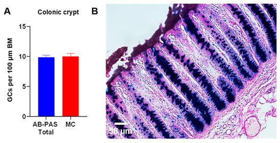 In the colon, the measurement of the mucin gel layer (Figure 3) and the goblet cell density within colonic crypts (Figure 7) demonstrated that the colon exhibits the highest goblet cell number per 100 μm of basement membrane (BM) and the thickest mucin layer in comparison to the small intestine. The morphometric analysis of the crypt architecture showed a crypt depth of 375 ± 17 μm using AB-PAS staining and 377 ± 19 μm in MC staining. This indicates a consistent structural dimension independent of the staining methods. Notably, AB-PAS-stained histological sections of porcine colon revealed that GCs exclusively contain mixed mucins within their apical regions of the cell, whereas acidic mucins predominated in the basal cellular portions, no neutral mucins were noticed (Figure 7B).