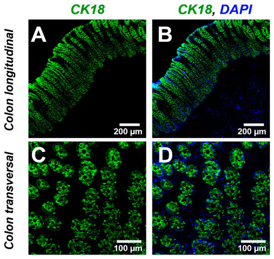 The anti-CK18 immunofluorescence staining showed a positive labeling in all GCs. Immunofluorescence analysis revealed strong CK18 expression within the colonic mucosa, evident in both transverse and longitudinal sections of the colonic crypts. No CK18 immunoreactivity was detected in the submucosa or muscularis layers (Figure 8).