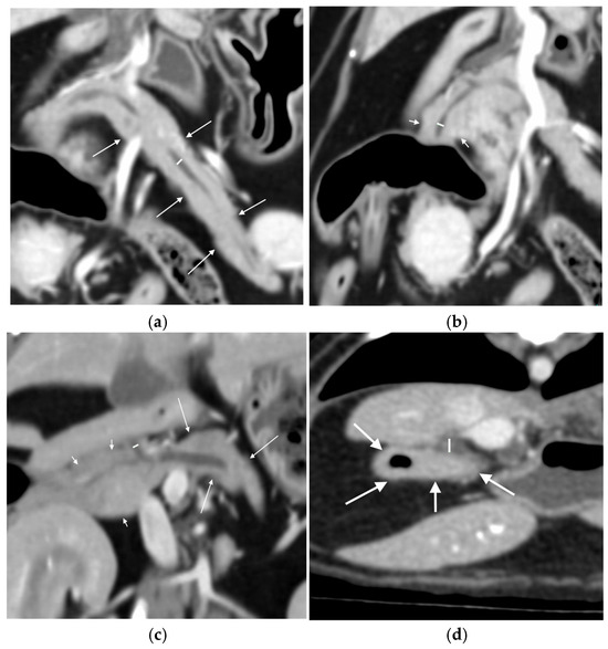 Figure 1. Locations of measurements of the left, right and common pancreatic ducts and the duodenal papilla: (a) measurement of the width (white line) of the left pancreatic duct at its widest point, seen on the dorsal plane multiplanar reconstruction in the left lobe of the pancreas (white arrows); (b) measurement of the width (white line) of the right pancreatic duct at its widest point, seen on the dorsal plane multiplanar reconstruction in part of the right lobe of the pancreas (white short arrows); (c) measurement of the width (white line) of the common pancreatic duct, seen on the dorsal plane multiplanar reconstruction as it exits the pancreas between the right lobe of the pancreas (white short arrows) and the left lobe of the pancreas (white longer arrows); and (d) diameter of the duodenal papilla (white line) measured on the post-contrast transverse image at the level where it enters the duodenum (white arrows). - Width from outer layer to outer layer, and Likert visibility scale pre and post-contrast, of the right pancreatic duct at its widest point on a dorsal plane reconstruction (Figure 1b).