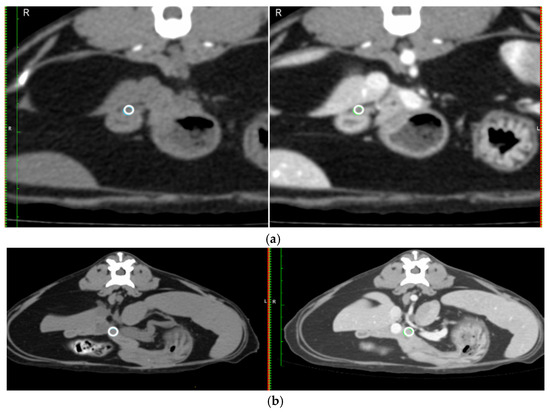 - Mean Hounsfield unit (HU) on a circular region of interest (ROI) placed over the duodenal papilla pre- and post-contrast on the transverse image (Figure 2a).