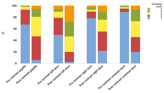 Stacked bar chart showing the percentage of cases to which each Likert scale was applied, comparing pre- and post-contrast visibility for the duodenal papilla, the left, right and common pancreatic ducts.