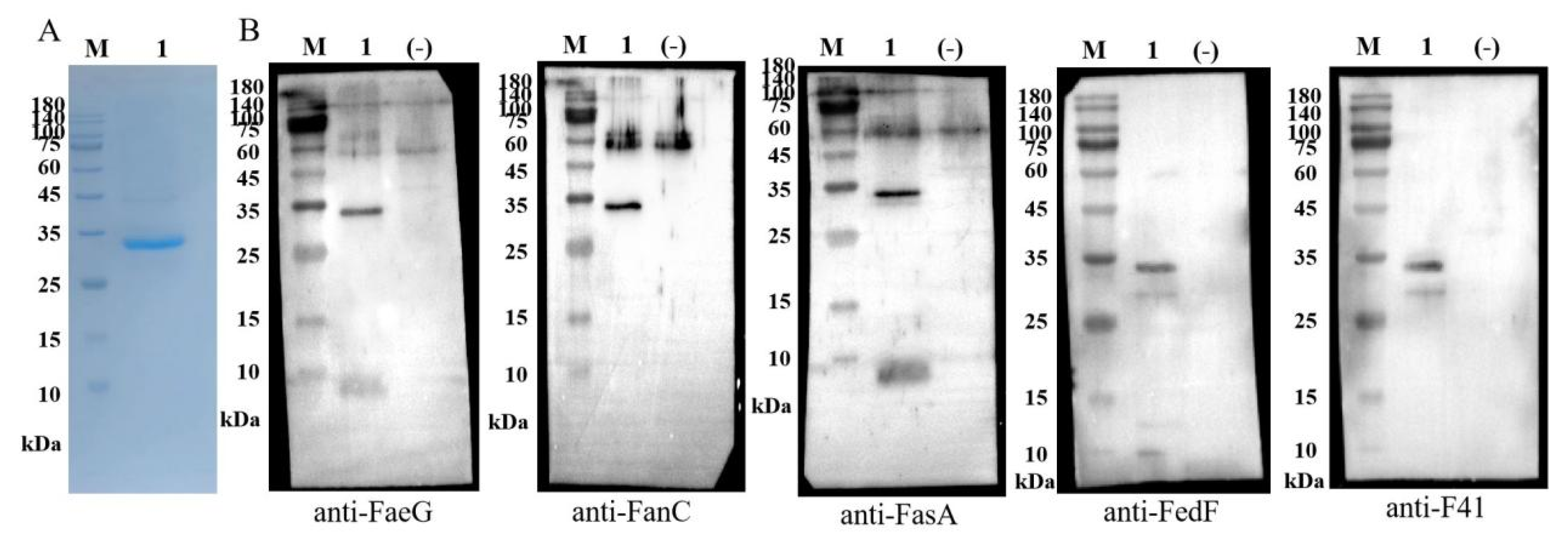 - Duan, Q.; Wu, W.; Pang, S.; Pan, Z.; Zhang, W.; Zhu, G. Coimmunization with two enterotoxigenic Escherichia coli (ETEC) fimbrial multiepitope fusion antigens induces the production of neutralizing antibodies against five ETEC fimbriae (F4, F5, F6, F18, and F41). Appl. Environ. Microbiol. 2020, 86, e00217-20. [Google Scholar] [CrossRef]