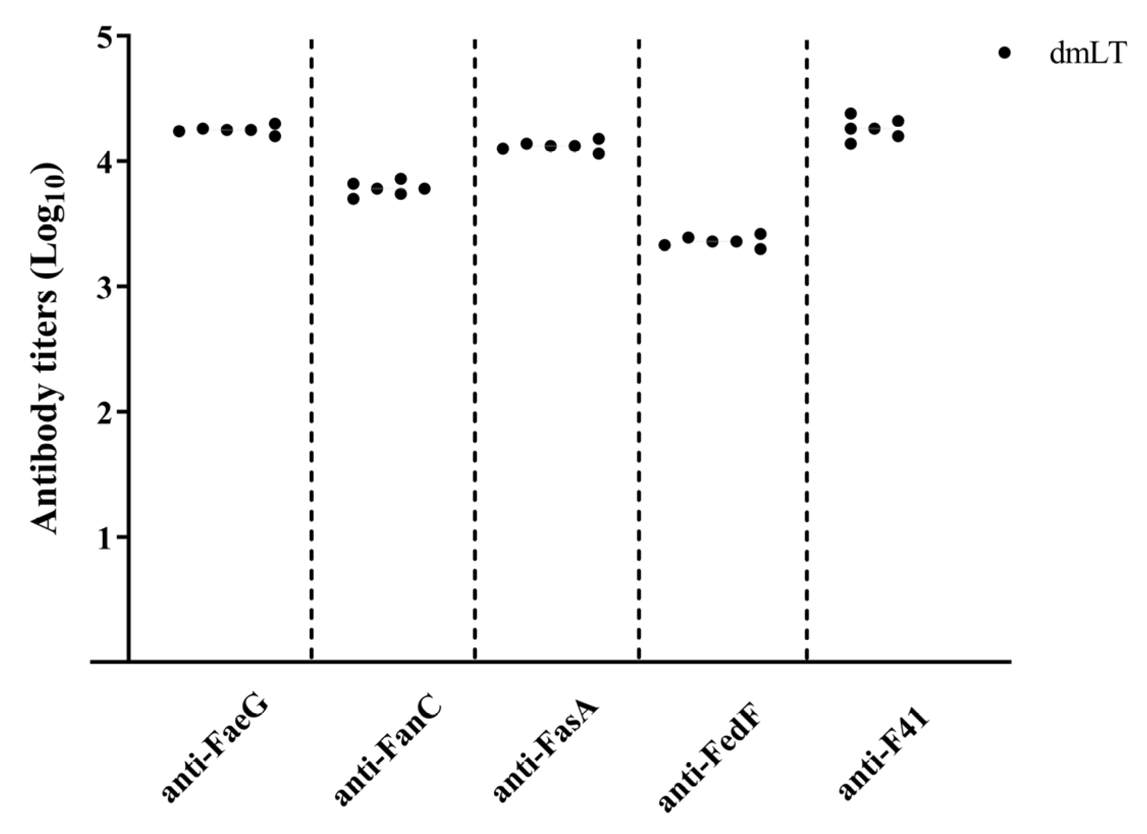3.1. dmLT MEFA Carried the Epitopes of the Five Fimbriae Subunits of ETEC