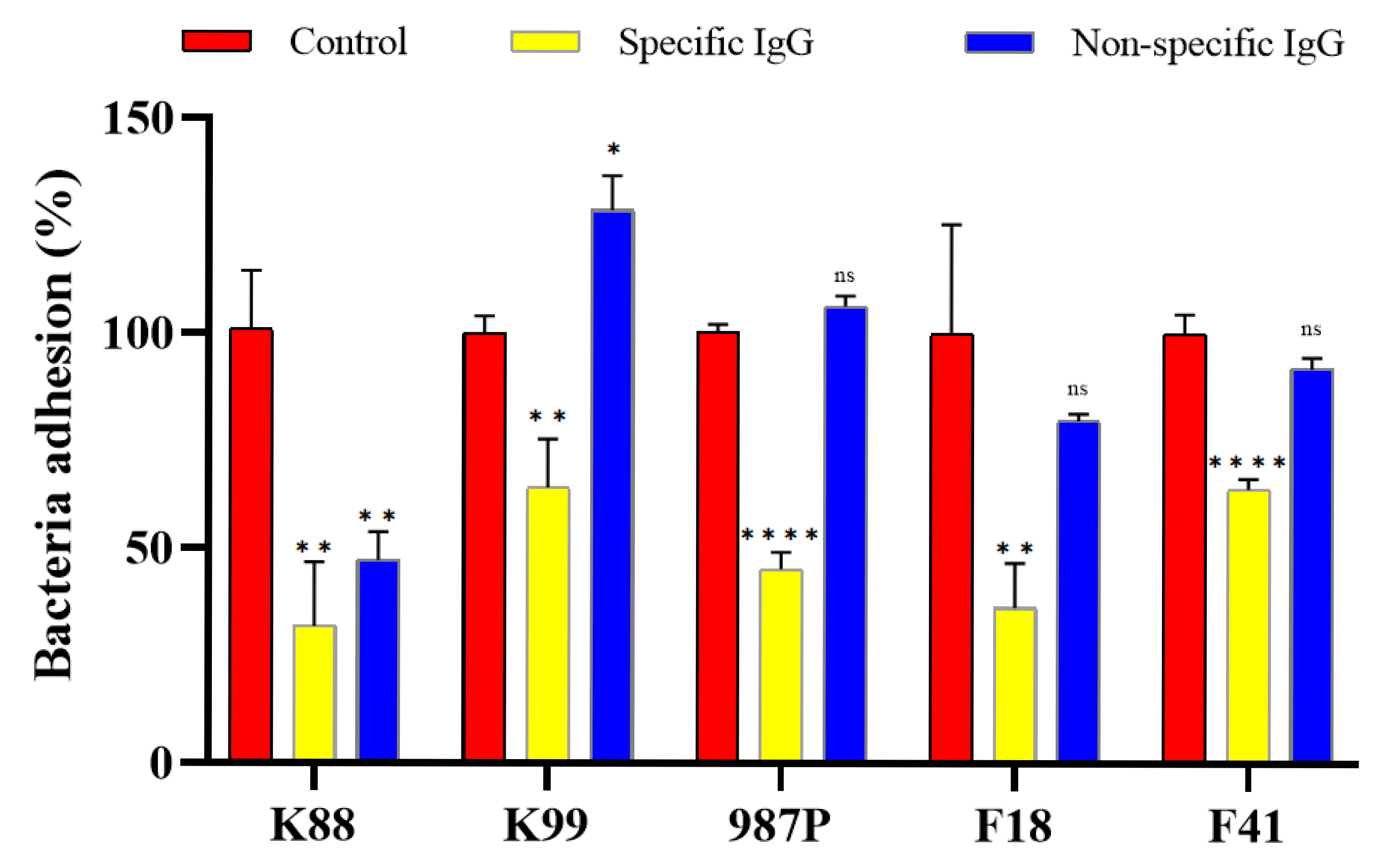 2.7. Rabbit IgG-Mediated Inhibition of K88+, F18+, K99+, 987P+, and F41+ ETEC Strain Adhesion to IPEC-J2